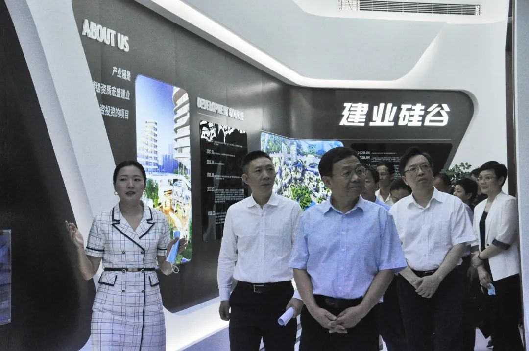 在建業(yè)硅谷總部經(jīng)濟(jì)園展廳,上饒市建筑科技產(chǎn)業(yè)園投資管理有限公司董事長(zhǎng)周金虎,向劉強(qiáng)主席簡(jiǎn)要匯報(bào)了建筑科技產(chǎn)業(yè)園項(xiàng)目自落戶上饒以來(lái)得到的政府支持以及所取得的成績(jī),并陪同觀看了宣傳視頻和展墻上相關(guān)板塊的介紹。