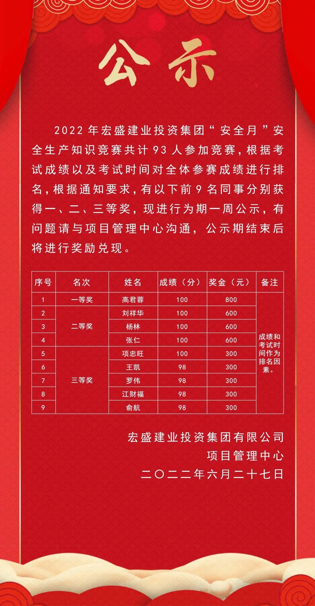 2022年6月20-24日,公司舉行安全知識(shí)網(wǎng)上競(jìng)賽活動(dòng),本次活動(dòng)共計(jì)有93位員工參加了在線考試,他們是集團(tuán)所屬所有項(xiàng)目管理人員,所有項(xiàng)目工程管理派駐人員,所有分公司工程部管理人員。員工們?cè)鷮?shí)的安全知識(shí)為他們?nèi)〉昧瞬诲e(cuò)的成績(jī),對(duì)這些優(yōu)秀的員工公司也對(duì)他們進(jìn)行了獎(jiǎng)勵(lì)。一等獎(jiǎng)1名,二等獎(jiǎng)3名,三等獎(jiǎng)5名,一等獎(jiǎng)獎(jiǎng)勵(lì)現(xiàn)金800元/人,二等獎(jiǎng)獎(jiǎng)勵(lì)600元/人,三等獎(jiǎng)獎(jiǎng)勵(lì)300元/人