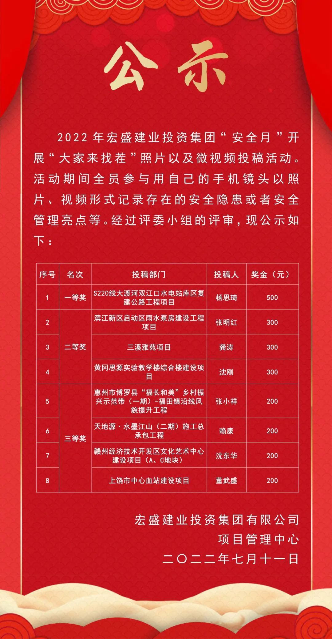 在安全月期間全員參與用自己的手機(jī)鏡頭以照片或者視頻形式記錄存在的安全隱患或者安全管理亮點(diǎn)等。利用身邊的素材對(duì)大家進(jìn)行安全宣傳;通過(guò)監(jiān)督渠道,曝光問(wèn)題隱患,提高大家的安全意識(shí)。評(píng)委小組評(píng)審出優(yōu)秀的作品將進(jìn)行表彰以及獎(jiǎng)勵(lì)(一等獎(jiǎng)1名,二等獎(jiǎng)3名,三等獎(jiǎng)4名,一等獎(jiǎng)獎(jiǎng)勵(lì)現(xiàn)金500元/人,二等獎(jiǎng)獎(jiǎng)勵(lì)300元/人,三等獎(jiǎng)獎(jiǎng)勵(lì)200元/人,優(yōu)秀作品推薦發(fā)布到集團(tuán)期刊中。