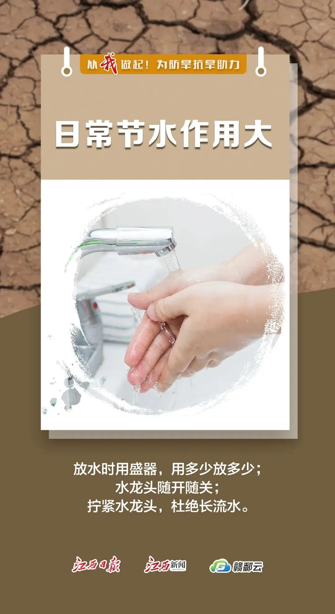 不舍細流,方成汪洋。讓我們用自己的實際行動,從我做起,從現(xiàn)在做起,樹立水憂患意識、節(jié)水意識、節(jié)電意識,養(yǎng)成良好習慣,為節(jié)水抗旱、節(jié)電保供工作出一份力、盡一份責。