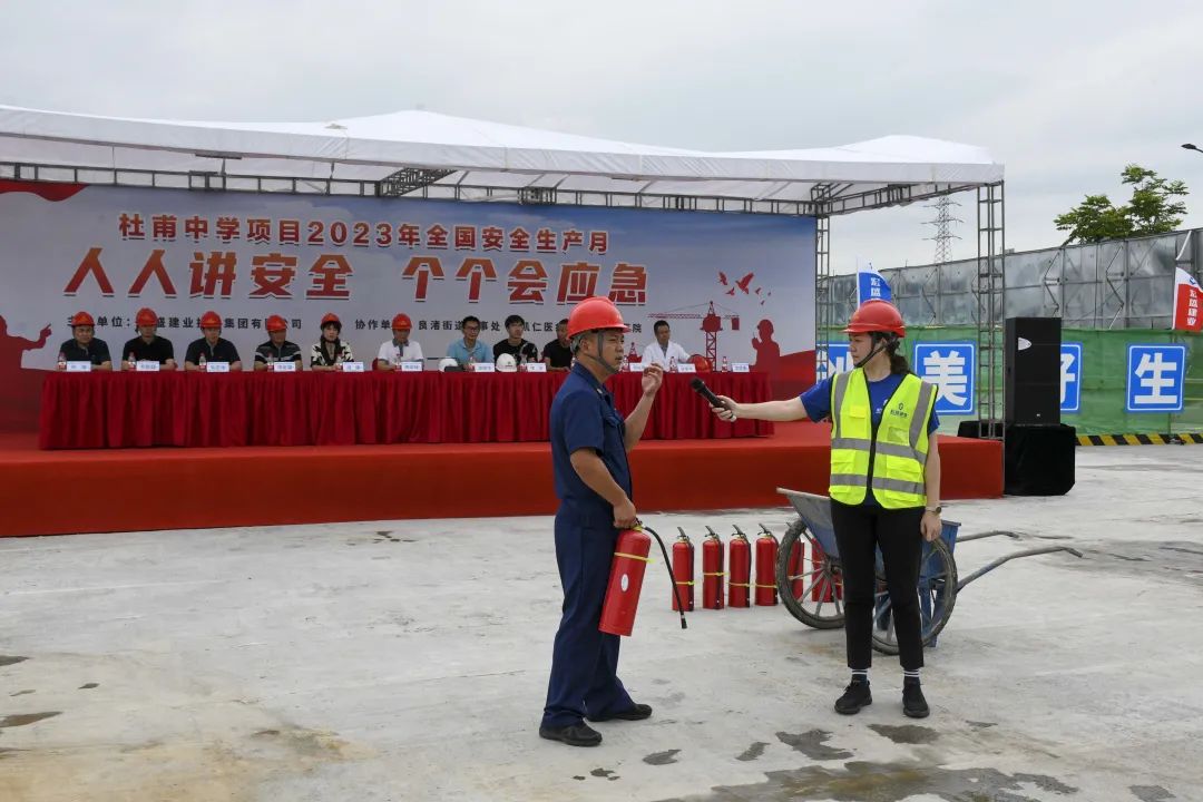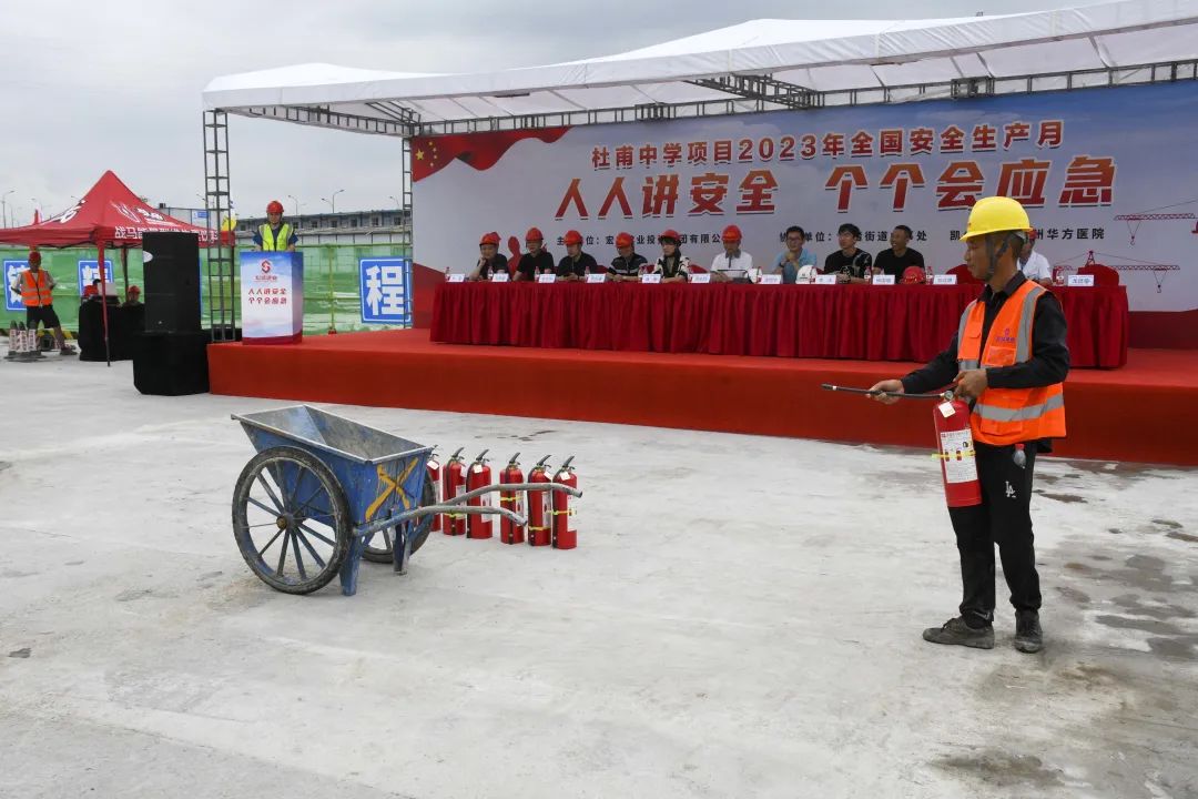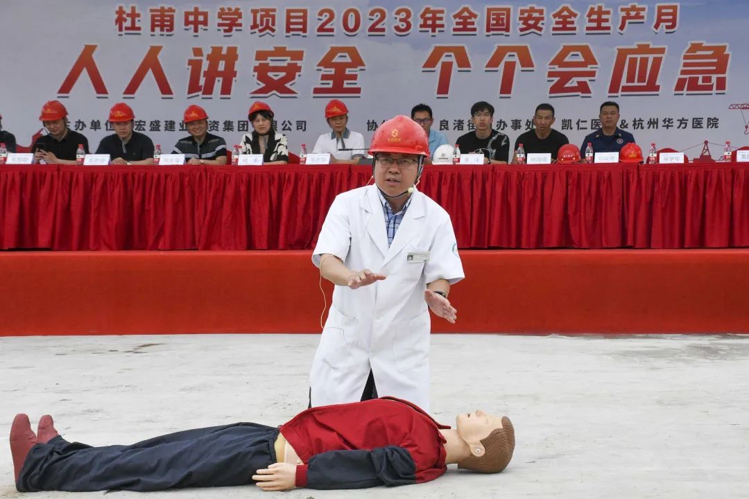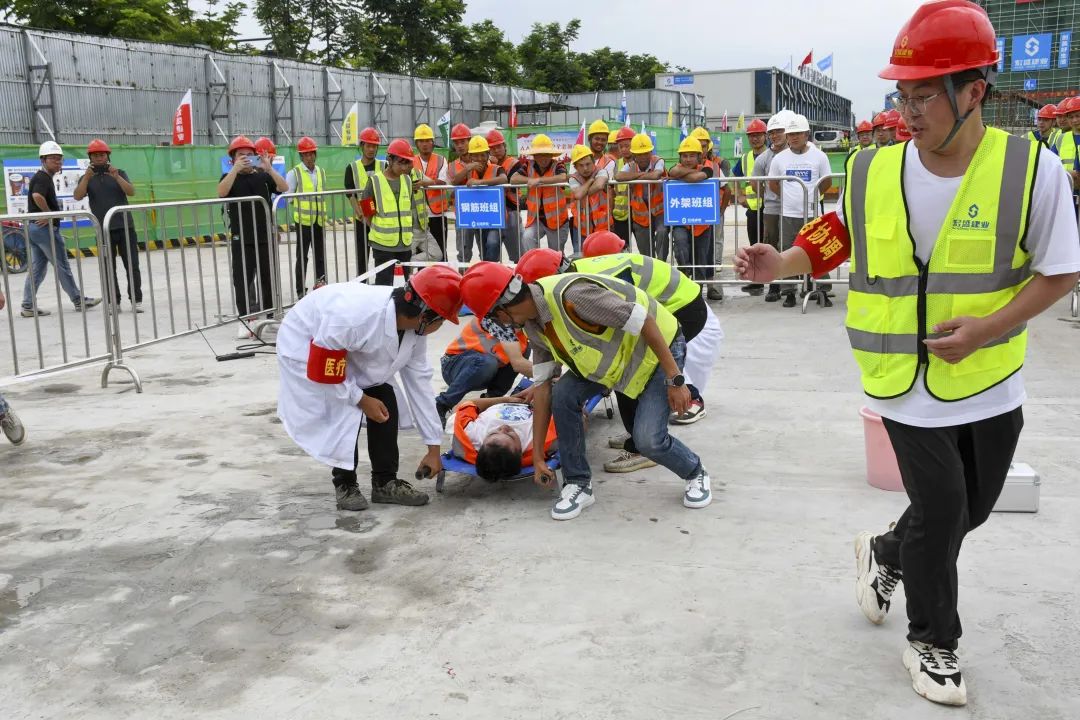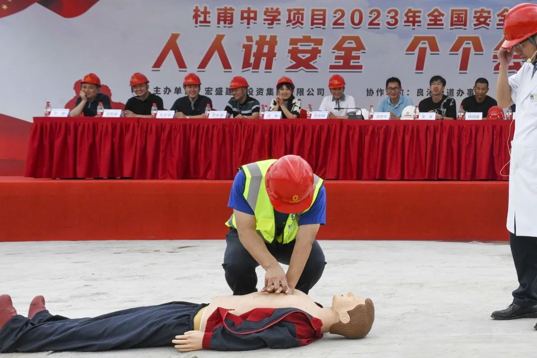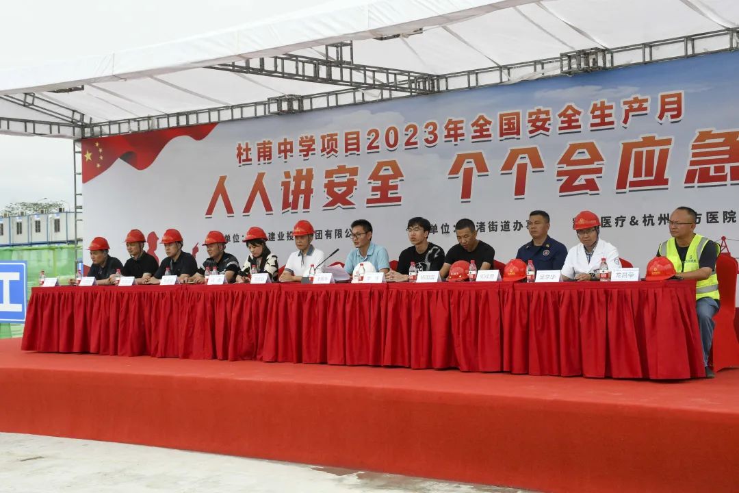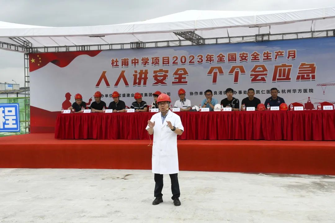 時值夏季,持續(xù)的高溫天氣給奮戰(zhàn)在一線的建筑工人帶來嚴(yán)峻考驗。為確保杜甫中學(xué)項目的安全生產(chǎn)工作順利開展,進(jìn)一步提升全員應(yīng)對突發(fā)事故的應(yīng)變能力,6月20日,杜甫中學(xué)項目舉行事故應(yīng)急救援演練,杭州良渚新城城建投資有限公司項目負(fù)責(zé)人凌錦華、杭州城投良渚新城開發(fā)有限公司項目負(fù)責(zé)人李洋、浙江嘉宇工程管理有限公司總監(jiān)理工程師楊國盛、良渚區(qū)域微型消防站站長鄧成勇、杭州華方醫(yī)院院長、主任醫(yī)師吳學(xué)華出席演練活動,集團(tuán)副董事長、總裁周金旺,監(jiān)事長、審計中心總經(jīng)理成承等核心高管代表一同出席,各參會代表與項目各方代表一同列隊參加。