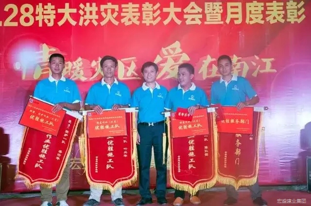 災(zāi)害面前,宏盛人挺身而出。災(zāi)難發(fā)生時(shí),項(xiàng)目指揮部立即啟動(dòng)抗洪搶險(xiǎn)緊急預(yù)案,調(diào)度全部力量奔赴前線參與抗洪,竭盡所能地給予他們生活上的幫扶,特別在項(xiàng)目部生產(chǎn)經(jīng)理李忠德的帶領(lǐng)下,當(dāng)日連續(xù)冒雨9小時(shí)搶通通往上兩鄉(xiāng)、關(guān)壩鄉(xiāng)上萬(wàn)人的生命通道,南江縣人民多次稱贊到:“宏盛沒有做不到的事情!”。路基三隊(duì)的工友們?cè)趽岆U(xiǎn)自救的同時(shí)還幫扶周圍的村民為他們提供物資。橋梁一隊(duì)沈敦民在巡查險(xiǎn)情時(shí),幫助一個(gè)即將落水的小女孩,避免了一場(chǎng)意外的發(fā)生。為了表示對(duì)宏盛人的感謝,南江縣橋亭鄉(xiāng)鳳凰村的村委會(huì)代表及被救小女孩的一家人,特地為集團(tuán)公司送上了“抗洪賑災(zāi)義伸援手,攜手共建和諧社會(huì)”的錦旗。