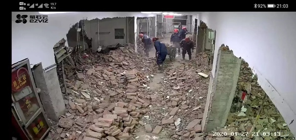 1月27日晚21時,施工隊伍依然忙碌著進行監(jiān)控安裝和現(xiàn)場清運。