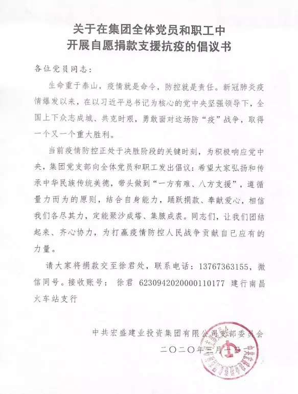 “抗擊疫情當先鋒,身體力行作表率”。在疫情面前,以集團董事長周金虎、副董事長周金旺同志為代表的一大批共產(chǎn)黨員,挺身而出,力求作為,截止目前,宏盛建業(yè)已從全國和海外采購了價值340多萬元的醫(yī)療防護物資,用于無償捐贈,為上饒市、新余市、宜春市、宜賓市、巴中市、四川涼山州,上海等市轄區(qū)的相關(guān)單位抗疫出力,出資近百萬元無償援建上饒市負壓病房和醫(yī)療廢物暫存站2個抗疫項目。