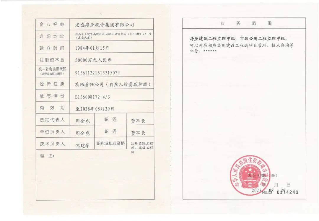 近日,中華人民共和國住房和城鄉(xiāng)建設(shè)部批準了宏盛建業(yè)的申請,公司成功獲得了房屋建筑工程監(jiān)理甲級和市政公用工程監(jiān)理甲級兩項資質(zhì)。