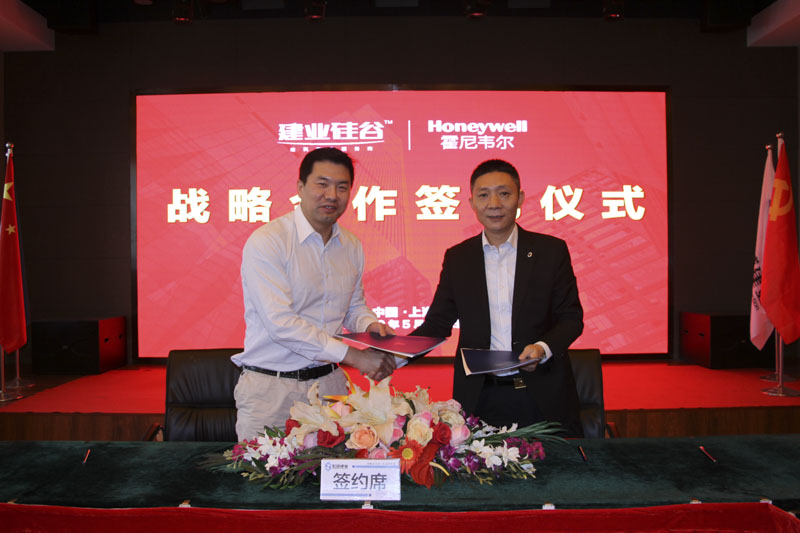 在宏盛建業(yè)上??偛浚晔⒔I(yè)投資集團(tuán)董事長周金虎與霍尼韋爾建筑智能系統(tǒng)部中國區(qū)總經(jīng)理?xiàng)铉婧炗嗛L期戰(zhàn)略合作協(xié)議。