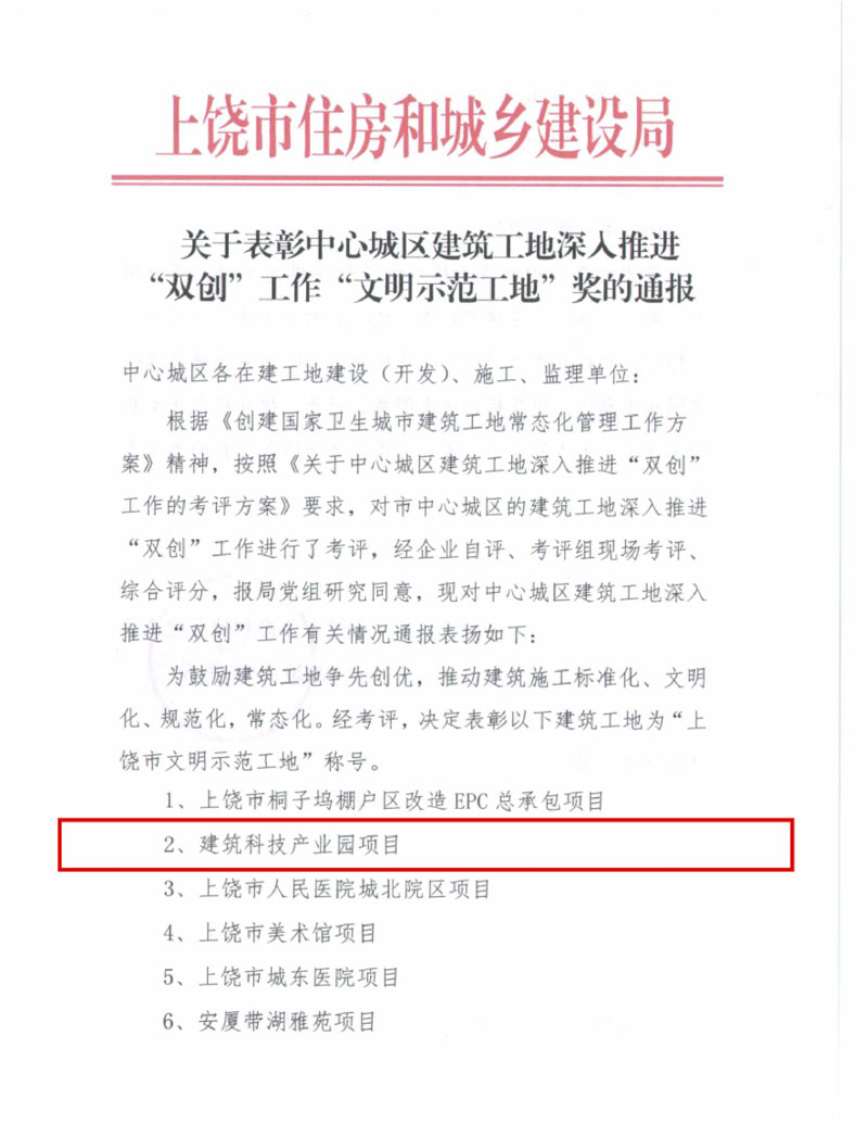 從上饒市住房和城鄉(xiāng)建設(shè)局公布的《關(guān)于表彰中心城區(qū)建筑工地深入推進(jìn)“雙創(chuàng)”工作“文明示范工地”獎(jiǎng)的通報(bào)》文件獲悉,集團(tuán)投資承建的“建業(yè)硅谷”上饒市建筑科技產(chǎn)業(yè)園項(xiàng)目,再次獲評(píng)“上饒市文明示范工地”。
