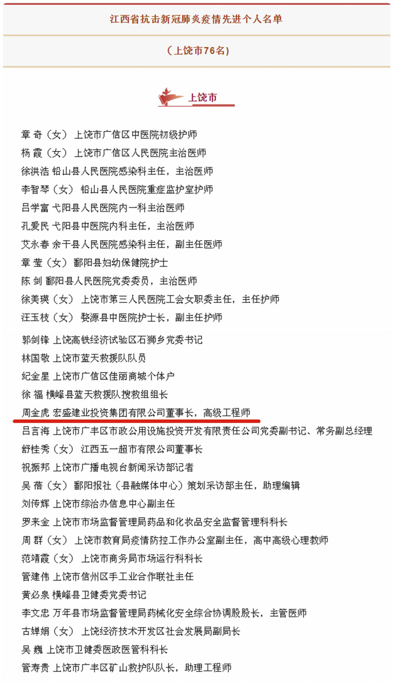 近日,從中共江西省委、省政府頒布的《關于表彰江西省抗擊新冠肺炎疫情先進個人和先進集體的決定》文件獲悉,宏盛建業(yè)投資集團董事長周金虎獲評“江西省抗擊新冠肺炎疫情先進個人”。