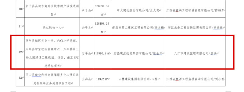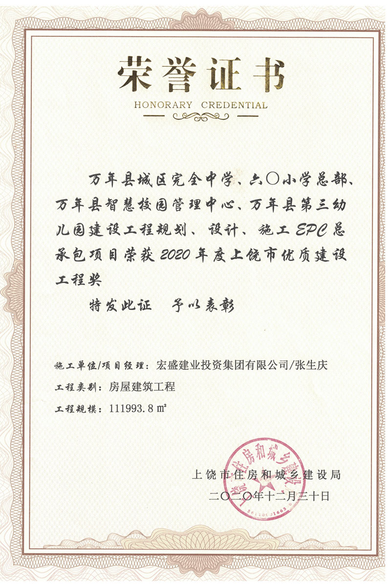 萬年縣城區(qū)完全中學、六〇小學總部、萬年縣智慧校園管理中心、萬年縣第三幼兒園建設工程規(guī)劃、設計、施工EPC總承包項目榮獲“2020年度上饒市優(yōu)質建設工程獎”;