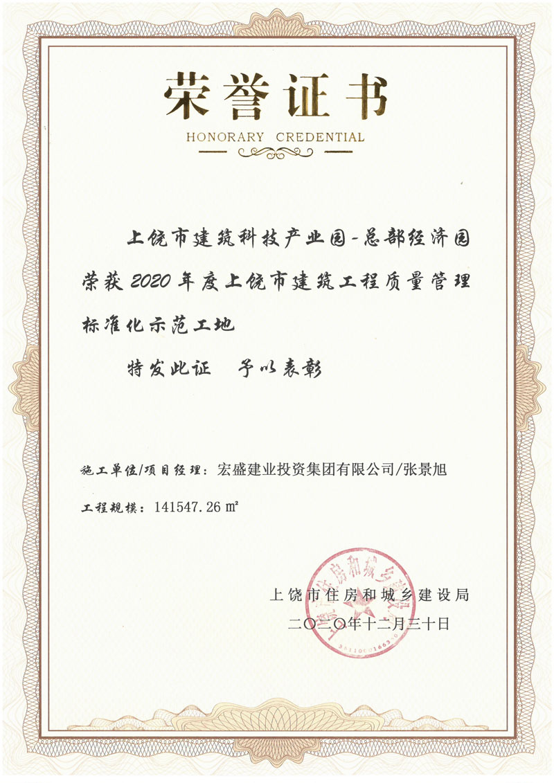上饒市建筑科技產(chǎn)業(yè)園-總部經(jīng)濟園項目榮獲“2020年度上饒市建筑工程質量管理標準化示范工地”。