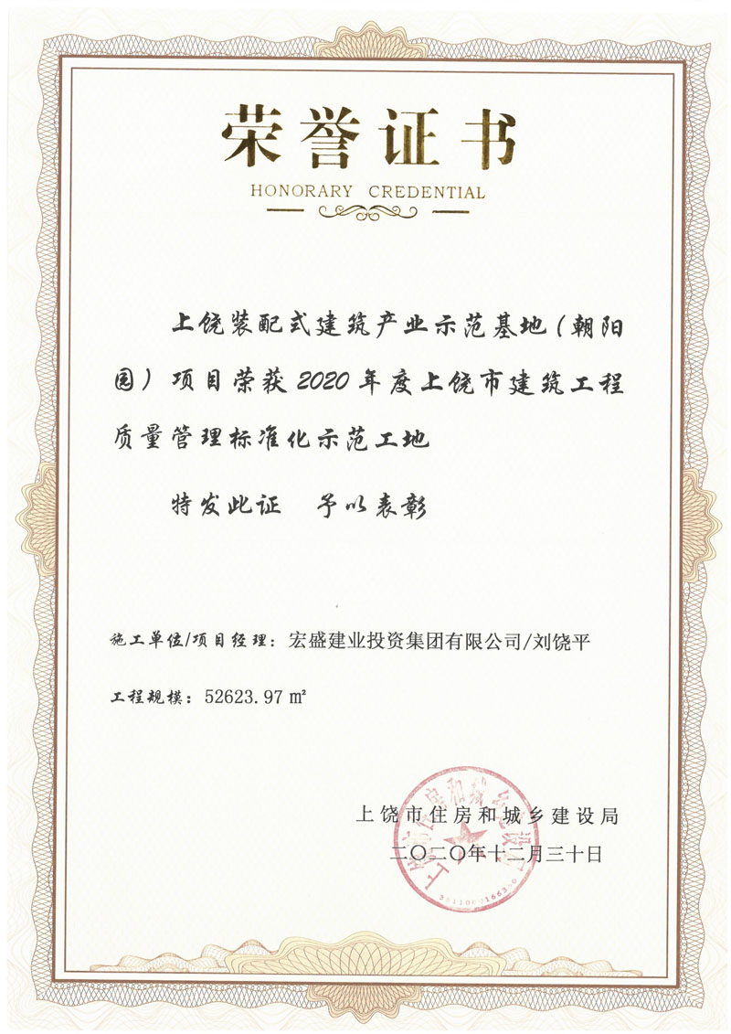 上饒裝配式建筑產(chǎn)業(yè)示范基地(朝陽園)項目榮獲“2020年度上饒市建筑工程質量管理標準化示范工地”。