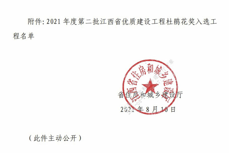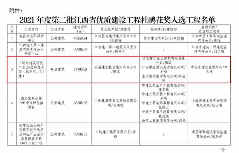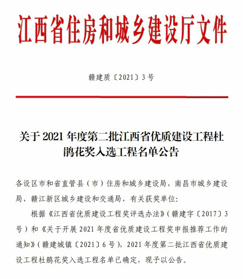 2021年8月10日,江西省住房和城鄉(xiāng)建設(shè)廳發(fā)布關(guān)于2021年度第二批江西省優(yōu)質(zhì)建設(shè)工程杜鵑花獎(jiǎng)入選工程名單公告,宏盛建業(yè)投資集團(tuán)房建工程項(xiàng)目——上饒市建筑科技產(chǎn)業(yè)園-總部經(jīng)濟(jì)園(地下室、2-4樓),榮獲“杜鵑花獎(jiǎng)”。