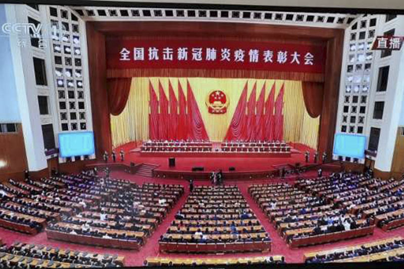 中共中央總書記、國家主席、中央軍委主席習(xí)近平向在抗擊新冠肺炎疫情斗爭中作出杰出貢獻(xiàn)的功勛模范人物頒授勛章獎(jiǎng)?wù)虏l(fā)表重要講話?!肮埠蛧鴦渍隆鲍@得者鐘南山、“人民英雄”國家榮譽(yù)稱號(hào)獲得者張伯禮、張定宇、陳薇四人在列。大會(huì)還對全國抗擊新冠肺炎疫情先進(jìn)個(gè)人、先進(jìn)集體、全國優(yōu)秀共產(chǎn)黨員、全國先進(jìn)基層黨組織進(jìn)行表彰。
