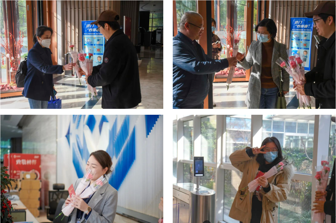 當(dāng)天,宏盛建業(yè)一樓大廳被布置一新,“宏盛藍(lán)”與“巾幗紅”碰撞出鮮明的活力,過節(jié)的喜悅洋溢在女工友們的臉上,她們們手捧鮮花,笑容甜入心坎。員工們紛紛表示,平時工作很忙,也不會給自己過什么節(jié)日,逢年過節(jié)都會收到公司的慰問和禮物,這她們的生活充滿了小驚喜,工作幸福感也大大提升!